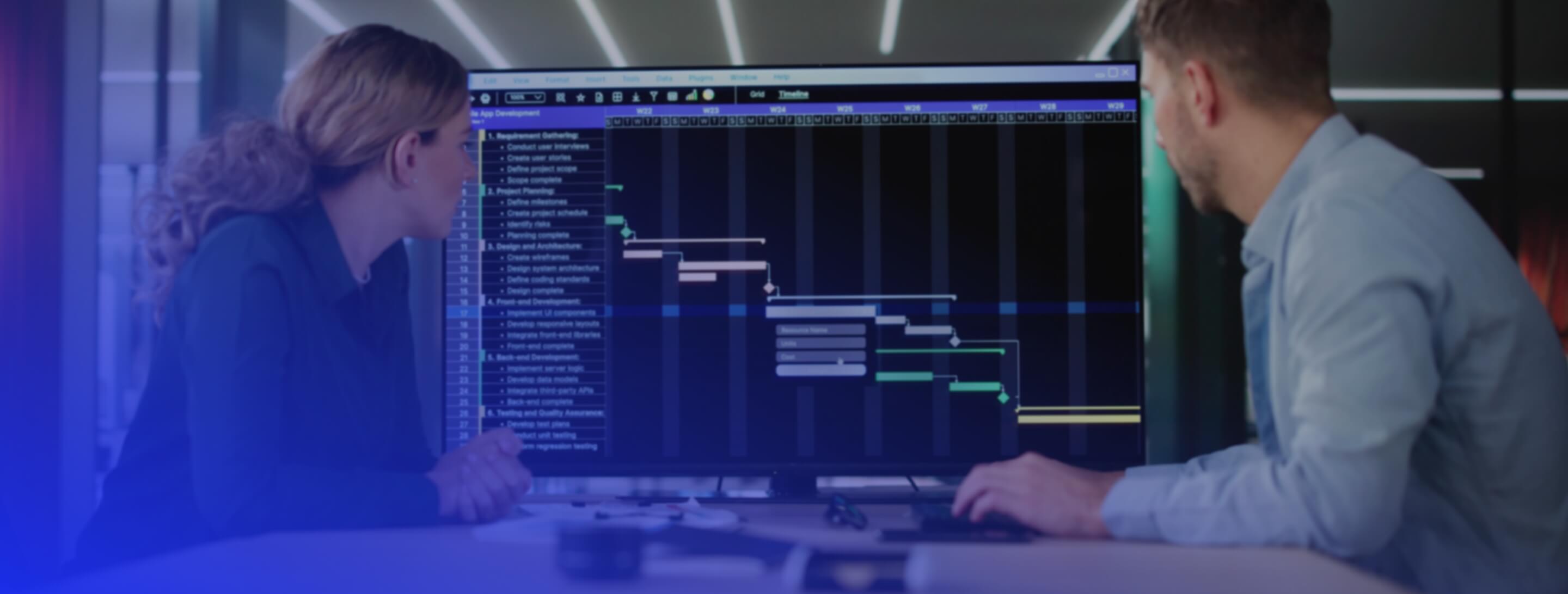 A female scientist in a lab, looking at a computer monitor displaying project schedule, with a microscope on the left.